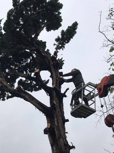 カゴ付きユニック 10メートルを超える貝塚息吹です。 作業員が搭乗できるカゴを備えたユニック車で枝落しの上、伐採を致しました。 このクラスですと、チェンソーは、バーの短い片手用とバーが長く重たい両手用の2タイプ以上は持込みます。